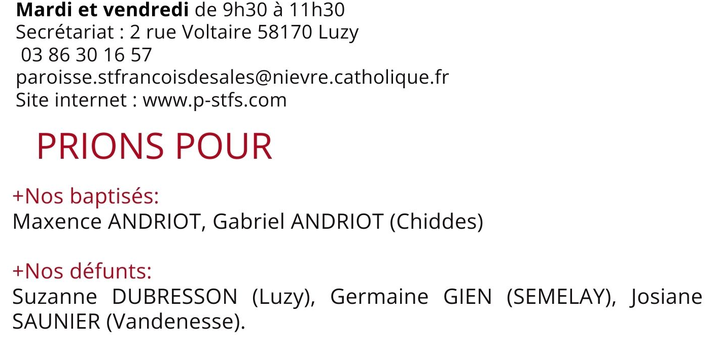 Paroisse du diocèse de Nevers (58) qui regroupe les communes de Avrée, Chiddes, Fléty, Glux-en-Glenne, Lanty, Larochemillay, La Nocle-Maulaix, Luzy, Millay, Montaron, Poil-en-Morvan, Préporché, Rémilly, Saint-Honoré-les-Bains, Saint-Seine, Savigny-Poil-Fol, Sémelay, Tazilly, Ternant, Vandenesse, Villapourçon.